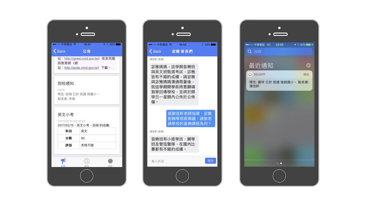 透過出勤管理,可針對學生到校/離校進行手動點名,家長APP將即時收到訊息, 班導師只能看到自己所負責的班級,主任及最高管理者權限才能看到所有班級。