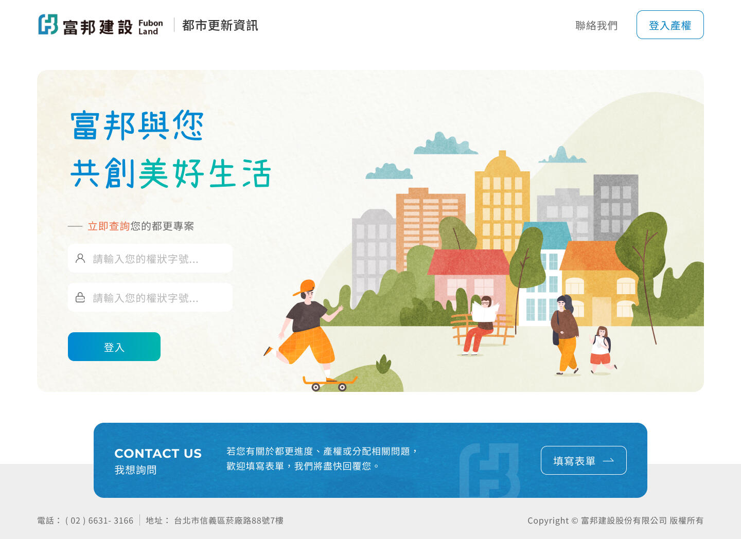 富邦建設都市更新專屬平台,提供執行中都更案所有權人查詢個案現況、都更進度等,瀏覽建築設計,了解選屋流程,協助您安心參與都市更新