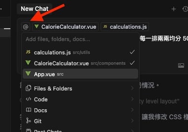 如果妳很清楚要改的檔案或是要參考的檔案是哪幾個的話,也可以手動指定檔案當做 Context,Cursor 會優先在這個範圍內搜尋或改寫。
