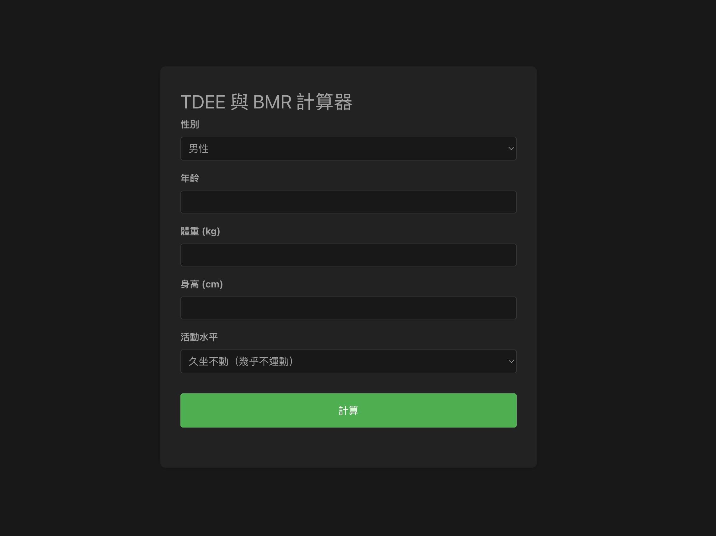首先,這次的示範,我打算做一個簡單的卡路里計算機,可以計算每個人一天的基礎熱量(BMR)與總熱量(TDEE)數值。