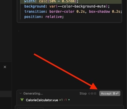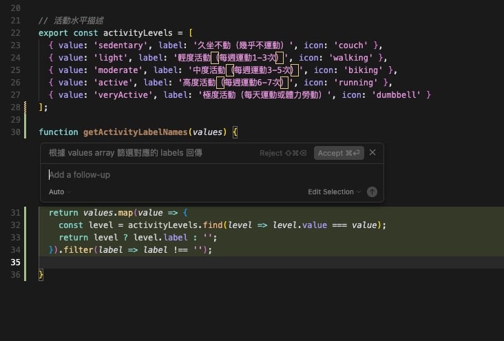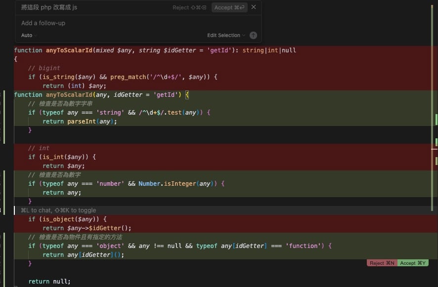 也可以圈選一段程式碼做修改,他會顯示改變的對比,同樣按下 Accept 就會套用