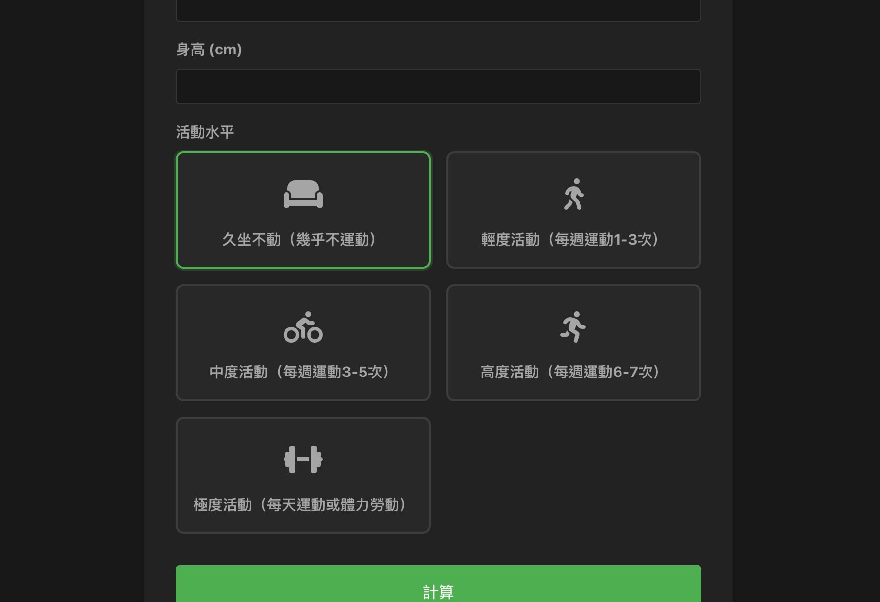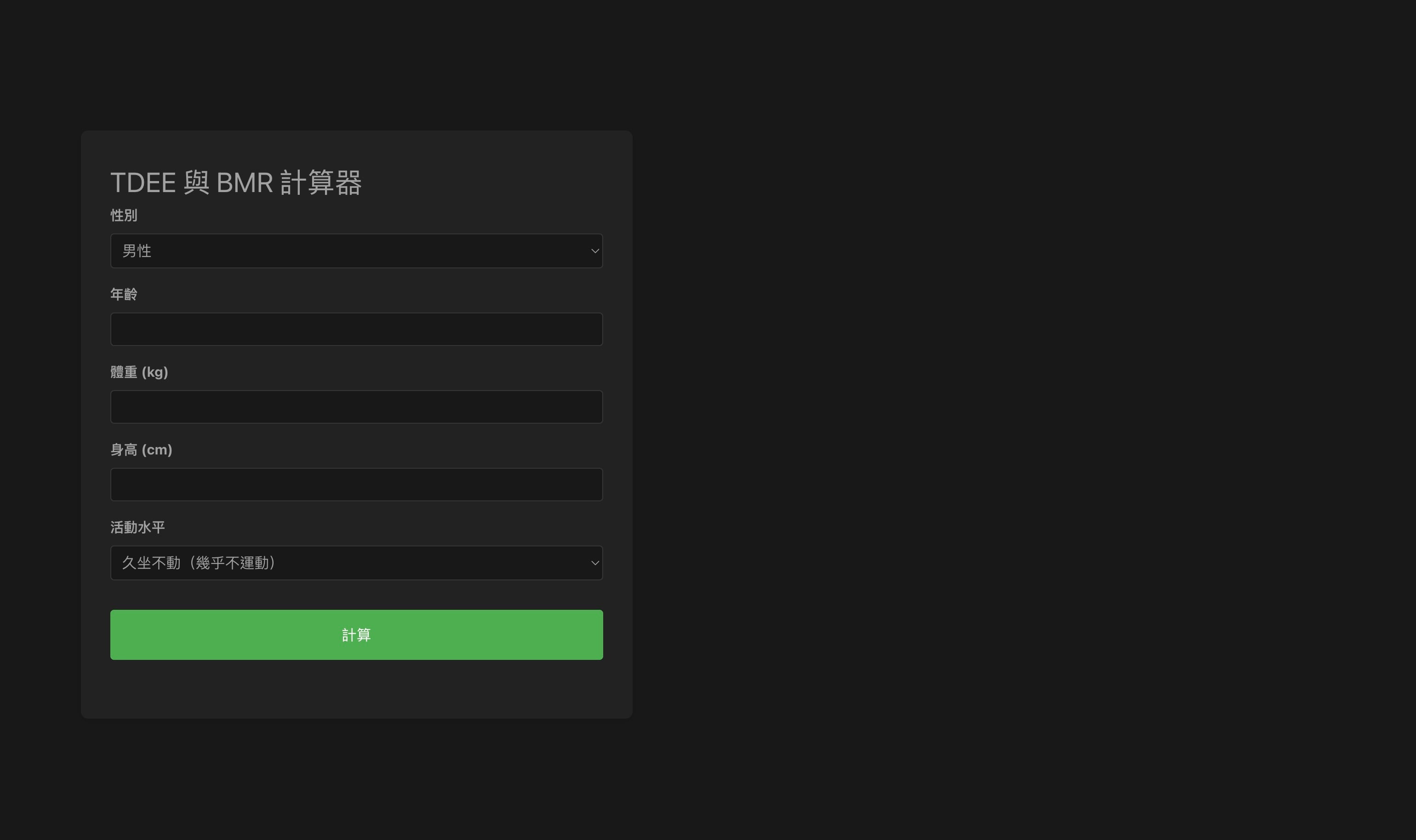 本文章夏格飛只用 Cursor + 口語化指令進行程式開發,不親手調整程式碼。預計製作一個簡單的卡路里計算器,可以藉由輸入身高、年齡與運動頻率等問題,計算出對應的基礎熱量消耗(BMR)與每日總熱量(TDEE)。下圖是最終成果。