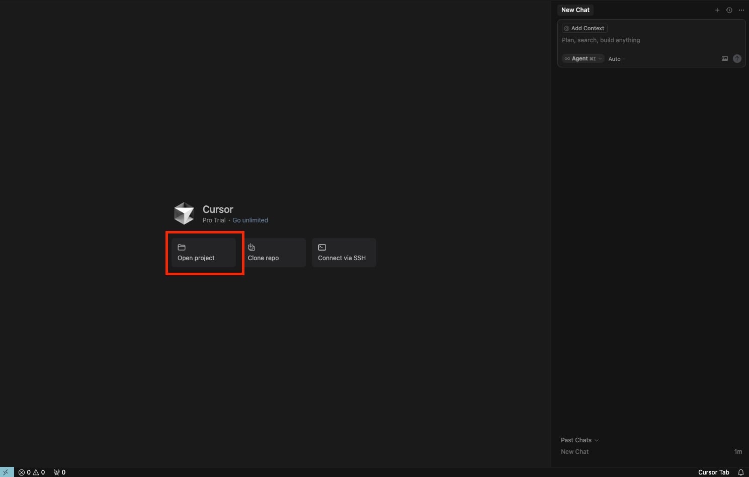 中間還會有一些像是條款同意的畫面就不一一贅述,完成後會來到編輯器畫面。右邊是與 AI 對話並請 AI 執行任務的視窗。左邊可以選擇 Open Project,也可以直接開始。