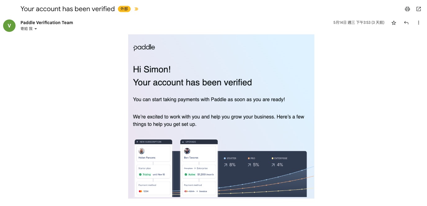 最終審查是集結所有前面的審查,所以任何 Paddle 有疑慮的地方,這裡都有可能再詢問一次,包含商業模式、公司名稱的證明等等。如果一切都沒有問題,這個步驟應該也是 2-3 天後就會過關了。