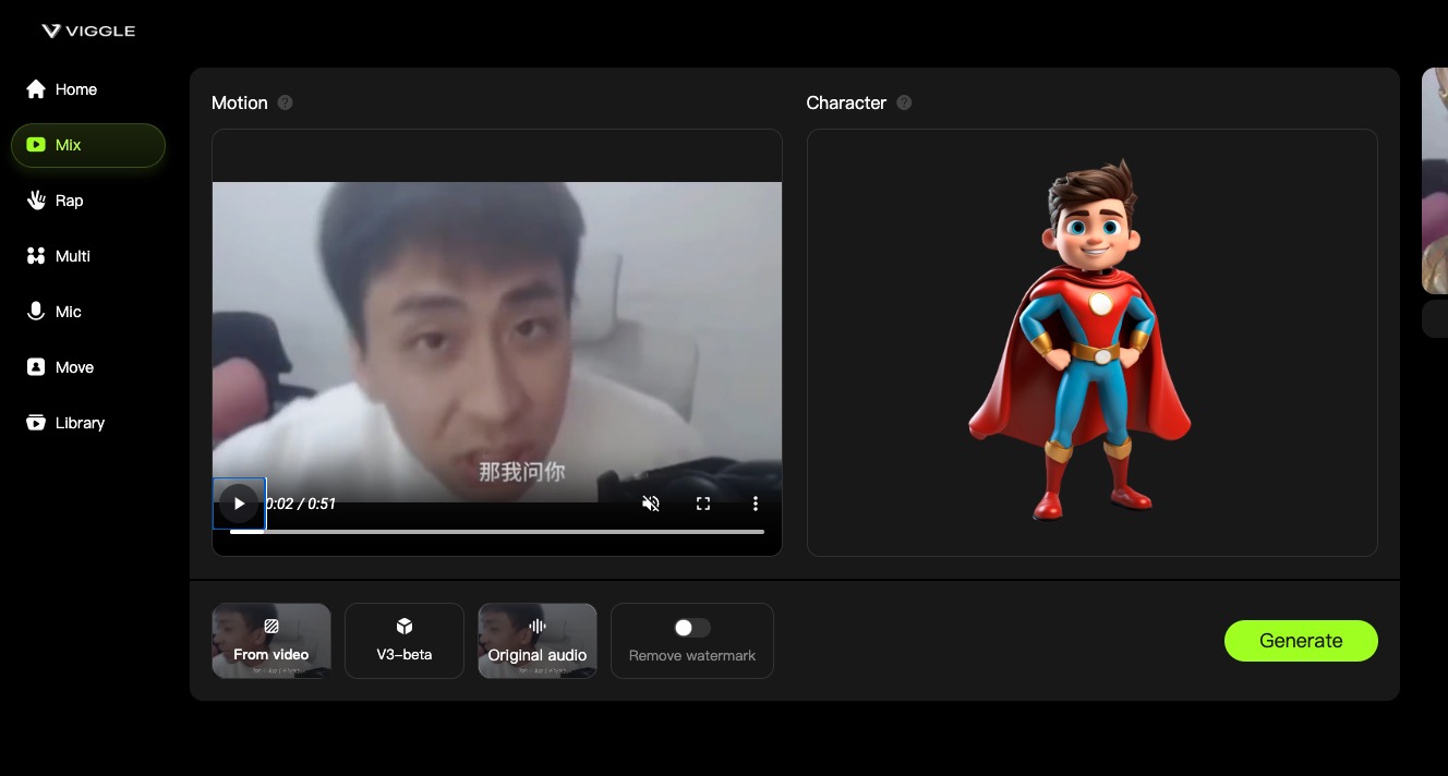 第二步:前往 Viggle AI 的 Mix 功能,將影片與你想要替換的人物上傳上去,按下 Generate 產生影片。
