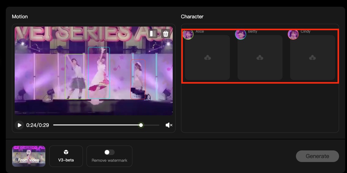 選擇後,系統會自動識別出影片中的人數,依序上傳對應的人物圖片,再按下 Generate 即可。